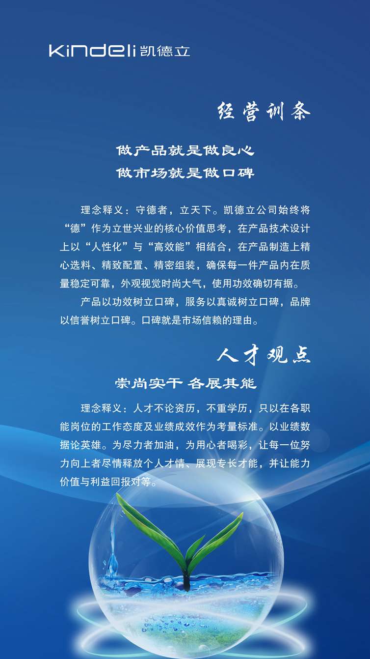 “凯德立”寓意:“凯和众生,德立天下”,其作为凯德立企业的品牌理念定位,即完整地强化了“凯德立”品牌字号的视听记忆,又突出了生命健康产业的企业特征以及“以德兴业”的企业格韵。凯德立公司正是基于“秉守好生之德,专注健康安和”的兴业理念,才潜心研发适用于千家万户的家用光疗产品,并以技术领先的科研优势强势推出具有更完善功能、更理想疗效的新一代光子治疗仪,以实现造福天下众生的企业职责使命。